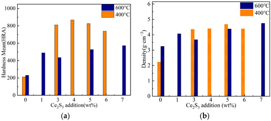 The density of Ce2S3-Cu2S is plotted in Figure 9b. The density of Ce2S3-Cu2S is larger than that of pure Cu2S, which also proves that Ce2S3 addition increases the density of Ce2S3-Cu2S. The density of 3 wt% Ce2S3-Cu2S increases by 52.5% compared to that of Cu2S at 400 °C, and the density of 7 wt% Ce2S3-Cu2S at 600 °C increases by 34.2% compared to that of Cu2S.