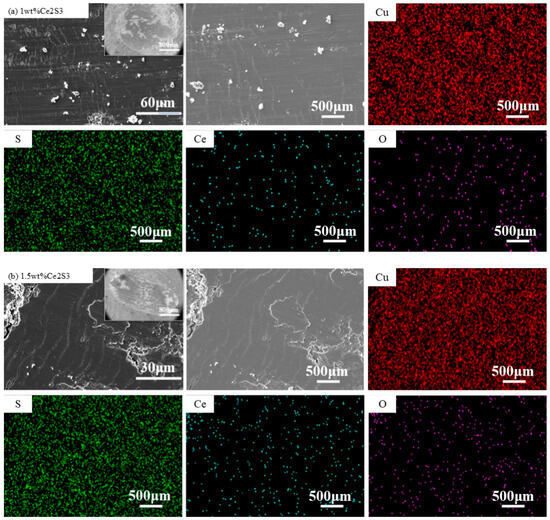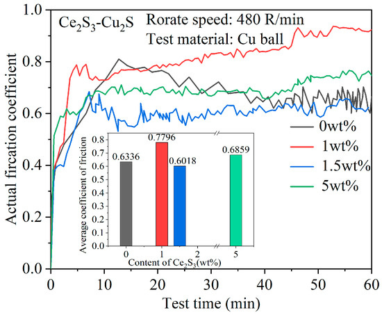 Figure 10 shows the variation of the friction coefficient of Ce2S3-Cu2S. As seen in Figure 10, both Cu2S and Ce2S3-Cu2S composites underwent rapid friction with the Cu ball friction vice at the initial stage of wear, resulting in a sharp increase in the coefficient of friction followed by stabilization. This is because the contact area between the Cu ball and the Ce2S3-Cu2S surface is small at the start. As the friction time increases, the contact area between Ce2S3-Cu2S and the Cu ball gradually increases, while the roughness of the contact surface decreases. This stabilizes the friction coefficient gradually. The average friction coefficients of 0 wt%, 1 wt%, 1.5 wt%, and 5 wt% are 0.7, 0.9, 0.65, and 0.6, respectively. The antifriction effect of the Ce2S3-Cu2S was similar to Ni55/Cu2S composite fabricated by laser cladding and low temperature ion sulfurizing, which is related to the oxidative protection of Cu2S and the bonding precipitation of Cu [42]. The 1 wt% Ce2S3 initially increases the friction coefficient of Cu2S due to improved hardness and wear resistance. However, at higher additions, the friction coefficient begins to decline.