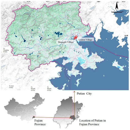 Red brick architecture in Putian City, Fujian Province, was selected as the research sample due to its characteristic climate and distinctive red brick construction techniques. The research team identified over a hundred of the densest and best-preserved red brick building clusters in Putian City. Ultimately, the study selected sites including Lou Tou Village and Shuang Fu Village (Table 1), where Shuang Fu Village is a traditional Chinese village and Lou Tou Village is listed as a historical and cultural town in Fujian Province. Both are typical areas with clusters of red brick buildings and are important research areas for the nomination of Min Nan red brick architecture as a UNESCO (United Nations Educational, Scientific and Cultural Organization) World Cultural Heritage site (Figure 1).