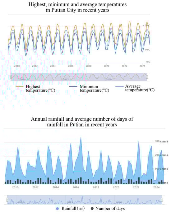 Climate temperature and precipitation conditions in the sampling area of Putian, Fujian Province. (Image source: https://www.worldweatheronline.com/putian-weather-averages/fujian/cn.aspx (accessed on 21 July 2025).)