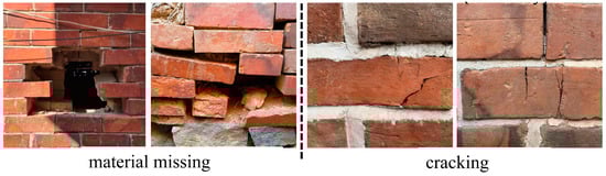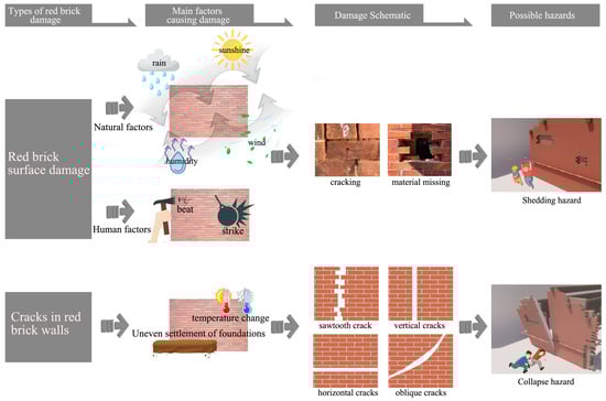 Red brick, as the surface structural material in red brick architecture, serves to enclose spaces and protect internal structures while also embodying cultural and aesthetic intentions. In red brick cultural district buildings across China and abroad, red brick walls have long functioned as primary decorative surfaces and even load-bearing structural elements. Their integrity and stability are crucial to the survival and continuity of red brick architecture. However, prolonged exposure to natural and human environments has led to varying degrees of structural damage in brick materials under conditions such as climate exposure and impact from human activities, most notably manifested as the continuous expansion of surface cracks [3]. Additionally, influenced by complex environmental factors and real-world changes in Asia and Europe, brick surfaces are prone to erosion from water and salt, leading to material degradation, cracking, and deformation. These damage phenomena directly or indirectly lead to a decline in the quality of building use [4]. The underlying mechanisms causing this impact include the influence of soluble salt corrosion within the brick material [5,6,7] and changes in the loads borne by the brick walls of buildings [8]. The degree of aging and degradation of brick materials is also critical to the safety of building structures. Effective identification models and health monitoring are important means of improving the management of such traditional brick building heritage [9]. Although certain destructive processes are relatively slow, resulting in little or no noticeable change or deformation in the structural elements and surface texture of materials [10], it should be recognized that once damage becomes apparent, such as obvious cracks, gaps, and material spalling or loss, this indicates that the safety of the building is at significant risk. Any damage has a significant impact on the overall characteristics of the building [11].
