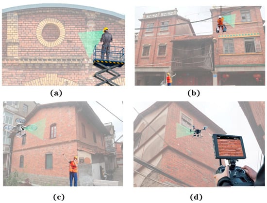 On-site sampling operations for traditional red brick damage types. (a) An inspection worker stands on a lifting platform, using equipment to inspect or maintain the walls of a brick building. (b) An inspection worker, on a hoist outside the building, performs work on the building’s walls, with personnel below providing guidance. (c) An inspection worker on the ground uses a drone to inspect the building. (d) An inspection worker controls the drone using a remote control, which inspects the building’s walls, with the images transmitted to a tablet device in real time. (Image source: drawn and annotated by the author.)