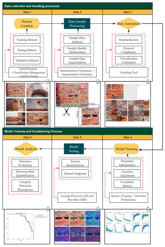 Unlike traditional methods that rely on manual on-site measurement, assessment, and judgment of red brick damage (Figure 7), this study primarily proposes a machine learning method that combines a computer vision model based on YOLOv12 with the protection of architectural heritage (materials). Through model iteration training, type testing, and application, many wall samples can be detected in a short period. This method can objectively, efficiently, and accurately define and classify the types of damage on brick surfaces, as well as quickly identify and locate them, which helps to promptly implement targeted repair measures. Additionally, the data obtained through this method can better assist researchers in conducting an in-depth exploration of red brick building materials. However, this method must be implemented under strict and standardized procedures to achieve high precision and widespread application. The main process consists of six steps (Figure 8).