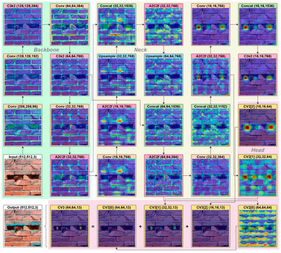 (1) In the backbone, the model downsamples and extracts features layer by layer through multiple cascaded Conv and C3k2 layers, extracting low-level texture information and mid- and high-level semantic information. The C3k2 module is one of the key modules in this architecture. It combines bottleneck stacking, cross-layer connections, and variable channel fusion strategies to effectively enhance the receptive field and improve the model’s nonlinear expression capabilities, making it suitable for extracting linear details such as red brick cracks.