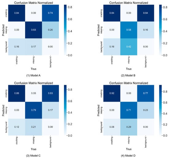 As shown in Figure 13, a comparison of the confusion matrices of the four models on the test set further validates the patterns previously identified in the analysis of precision, recall, mAP, and PR curves. Model A demonstrates strong recognition capabilities for both cracking and missing impairments, particularly achieving an accuracy of 0.83 in the missing category, demonstrating overall good balance. Model B, on the other hand, clearly underperforms in the missing category, with a high confusion rate and numerous misclassifications between the background and missing categories. This is consistent with its poor recall as shown in the PR curve. Model C achieves the highest accuracy (0.88) in the cracking category but exhibits some bias in the missing category, suggesting slightly uneven performance. Model D performs most effectively in the cracking category, achieving an accuracy of 0.92 and 0.71 in the missing category, demonstrating good overall robustness, but exhibits some error in the background category.