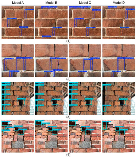 As shown in Figure 15(1), in the missing brick detection task, only model A was able to fully identify the locations of the three missing bricks, demonstrating strong adaptability, while models B, C, and D all missed detections, indicating that their stability was insufficient under high-resolution complex backgrounds. In Figure 15(2), model C performed the best, accurately detecting all cracked locations, demonstrating its strong generalization ability in crack recognition, while models A and B missed detections, and model D produced false detections, suggesting that it was somewhat confused by the complex background texture. Figure 15(3) further verified this trend. Model C was still able to fully identify all cracks, maintaining a high degree of detection consistency, while model A missed the crack on the left, and models B and D had additional false detections, indicating that their discrimination ability was reduced under the interference of complex textures and shadows. Finally, in Figure 15(4), model A and model D completely detected all missing bricks, showing good robustness, while model B and model C misidentified some brick edges as cracks, indicating that they still have certain limitations in distinguishing missing and crack features.