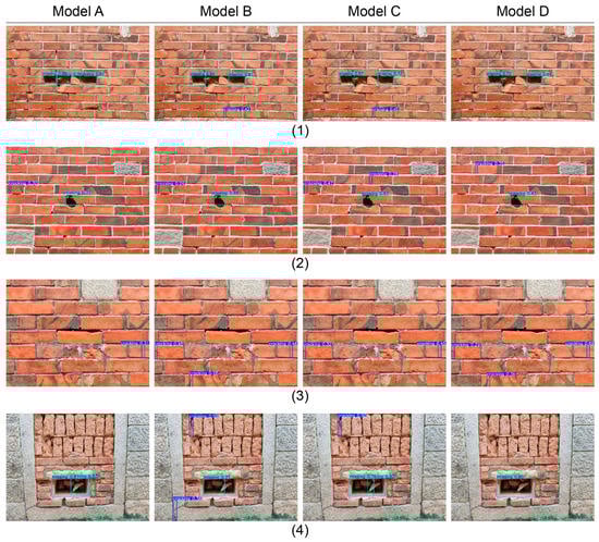 As shown in Figure 14, in comparison with the detection results of the training set, different models show certain differences in the recognition of cracked and missing bricks. As shown in Figure 14(1), model A can completely detect the three crack damages in the image, showing a strong detection sensitivity, while models B, C, and D have missed detection or false detection, especially at the edge of the crack. In Figure 14(2), model A detected four crack areas, but there was a repeated labeling of the crack at the bottom of the image, and the actual crack was mistakenly divided into two. In contrast, although models B, C, and D avoided repeated detection, they all missed the crack on the far left, indicating that their perception ability of fine cracks is slightly insufficient. Figure 14(3) further shows the detection effect of missing bricks. Model A gave relatively accurate recognition results for all missing bricks on the left side of the image. Models B, C, and D all had some missed detections, indicating that model A has a greater advantage in this type of defect recognition task. However, it can also be discerned from the diagram that when environmental conditions bear a high degree of similarity to the visual characteristics of a particular injury type, the model may categorize the factors present in that environment as belonging to that injury type. This leads to an increased error rate in the detection results. For instance, the model might detect a surrounding black environment and misclassify it as a missing type. Finally, in Figure 14(4), all four models experienced a certain degree of missed detection when faced with the complex situation of large-area damage. However, overall, model A had relatively fewer missed detections, demonstrating a more stable detection effect. Overall, model A achieved detection accuracy above 0.80 on the training set, demonstrating more comprehensive coverage and capturing greater detail in damage but also exhibiting individual false detection issues. The other three models performed relatively conservatively, with less stable detection accuracy. While they missed more instances, they produced fewer false positives.