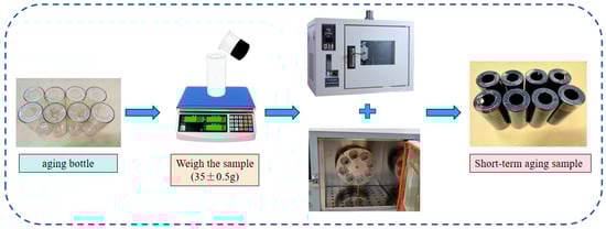 In compliance with JTG E20-2011 specifications, short-term aging was simulated using the Rolling Thin Film Oven Test (RTFOT) to evaluate the oxidative degradation of 70# base asphalt and SBS-T-modified asphalts during production and construction phases. The standardized protocol commenced with heating virgin asphalt to 160 ± 5 °C until complete fluidity was achieved, followed by precise measurement of 35.0 ± 0.5 g aliquots into pre-cleaned borosilicate glass bottles. Samples were then aged in a preheated RTFOT chamber at 163 ± 0.5 °C for 85 min under strictly controlled conditions, including 4000 ± 200 mL/min filtered dry air flow and 15 ± 0.2 rpm rotational speed. Immediately after aging, samples were collected for comparative testing, with the process maintaining <2% mass loss tolerance to ensure valid simulation of field aging mechanisms. This methodology (illustrated in Figure 3) effectively replicates thermo-oxidative binder hardening during mix production and paving operations while guaranteeing reproducible results through precise parameter control.