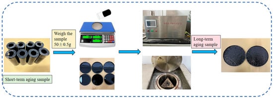 Asphalt undergoes sequential aging processes, beginning with short-term aging during construction (mixing and paving) followed by progressive long-term aging under environmental exposure during service life. To evaluate oxidation resistance under controlled conditions, this study conducted Pressure Aging Vessel (PAV) tests on 70# base asphalt and modified variants according to JTG E20-2011 specifications, using a precision PAV system (Tianjin Port Original Inspection Instrument Co., Ltd., Tianjin, China). The standardized protocol involved the following: (1) preparing 50 ± 0.5 g aliquots of RTFOT-aged asphalt in stainless steel pans (150 × 25 × 10 mm); (2) aging samples at 100 ± 0.1 °C and 2.1 ± 0.05 MPa for 20 ± 0.5 h to simulate approximately 5–10 years of field aging; and (3) immediate extraction of aged samples for subsequent analysis. The complete preparation process is illustrated in Figure 5, demonstrating our rigorous approach to replicating long-term oxidative aging in laboratory conditions while maintaining precise environmental controls (±0.1 °C temperature stability). This methodology provides reliable simulation of in-service aging mechanisms critical for performance evaluation of modified asphalts.