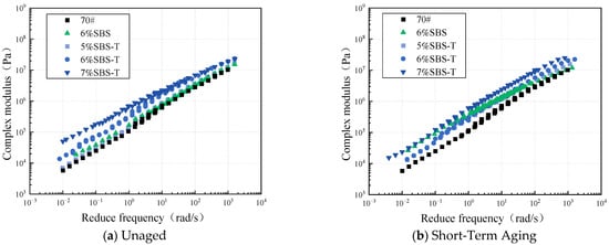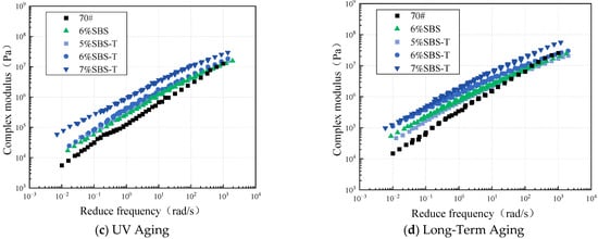 - Under long-term aging conditions, the complex modulus of modified asphalt increased, particularly for 6% SBS-T and 7% SBS-T high-viscosity high-elasticity modified asphalt. Long-term aging enhances oxidation and crosslinking reactions in asphalt, thereby improving its stiffness and fatigue resistance. The high-viscosity high-elasticity SBS-T-modified asphalt demonstrates superior durability compared to both base asphalt and SBS-modified asphalt with the same dosage during this process. Notably, the 7% SBS-T-modified asphalt exhibits the highest complex modulus values, indicating that it maintains excellent mechanical performance and durability even under prolonged loading and environmental variations.