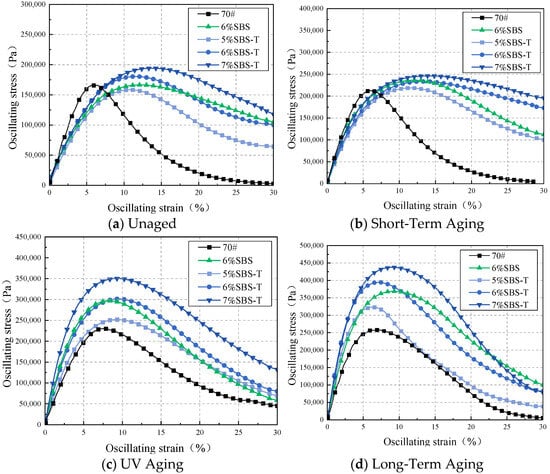 - Under identical strain conditions, the peak shear stress of SBS-T-modified asphalt is significantly higher than that of 70# base asphalt and SBS-modified asphalt at equivalent dosages, with a broader peak shear stress range. This indicates that SBS-T-modified asphalt possesses greater strength and enhanced resistance to shear deformation. After long-term aging, the peak stress of SBS-T-modified asphalt exceeds that of UV-aged samples, suggesting that long-term aging has a more pronounced effect on its strength and hardness than UV aging.