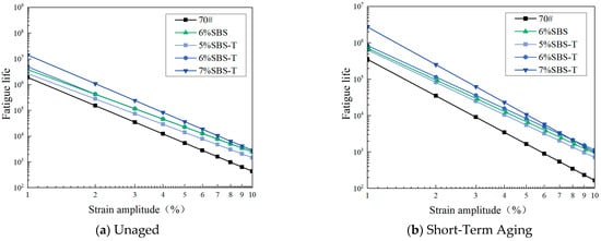Figure 12 presents the fatigue life of SBS-T-modified asphalt under different strain levels. The results demonstrate the following:
