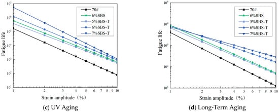 - Across all aging conditions, SBS-T-modified asphalt exhibits superior fatigue life compared to both 70# base asphalt and conventional SBS-modified asphalt at equivalent dosages, with a pronounced increasing trend observed with higher SBS-T content.