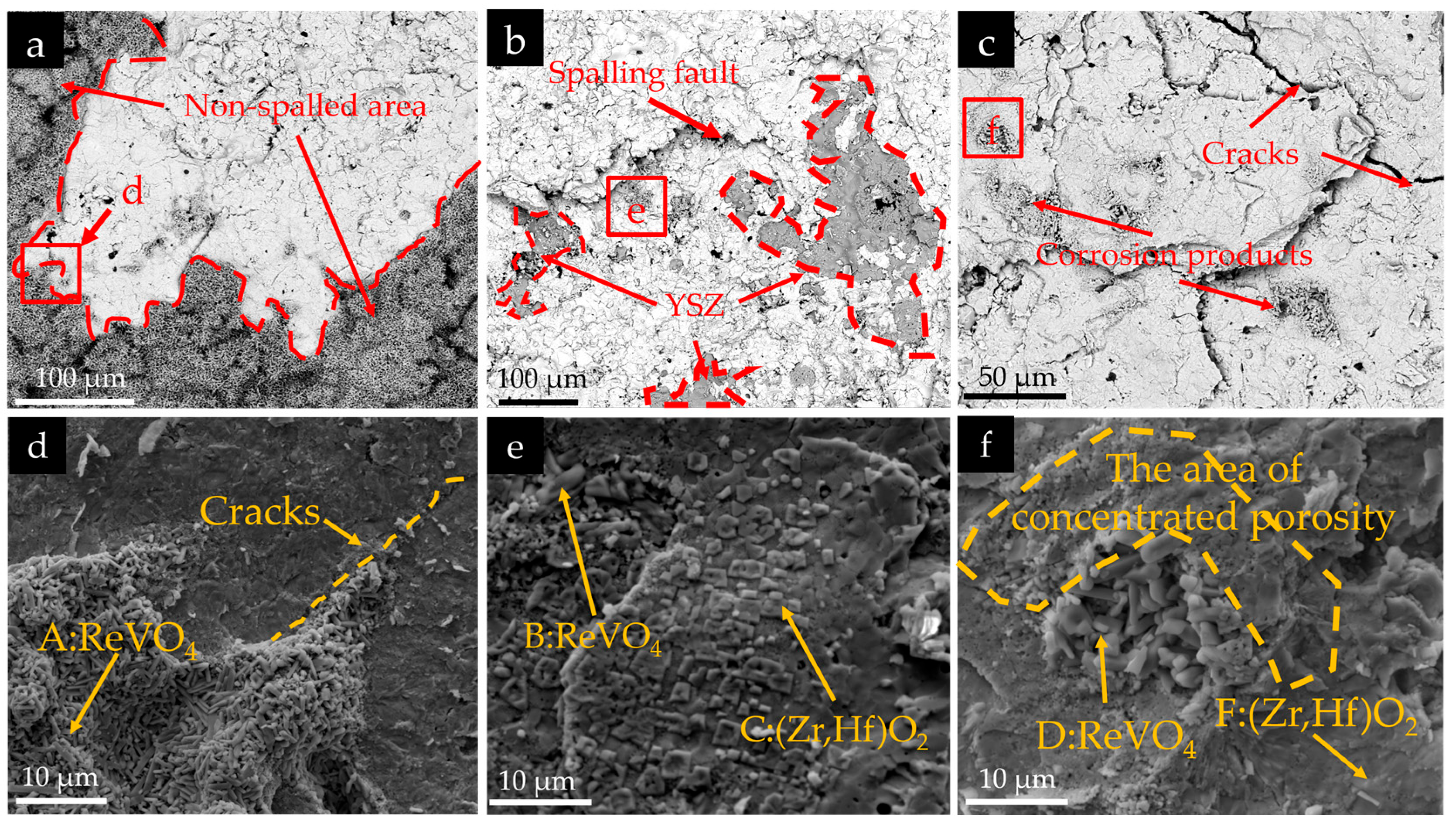 Figure 10d–f that the rod-like corrosion products in regions A, B, and D on the surface of the corroded RHZ coating are mainly composed of rare-earth elements Re (Sm, Gd, Dy, Er, Yb), V, O, and a small amount of Zr and Hf elements. Meanwhile, compounds mainly composed of Hf, Zr, and O elements can be observed in regions C and E on the surface of the RHZ coating. In conclusion, the rod-like corrosion products on the surface of the RHZ/YSZ coating are mainly ReVO