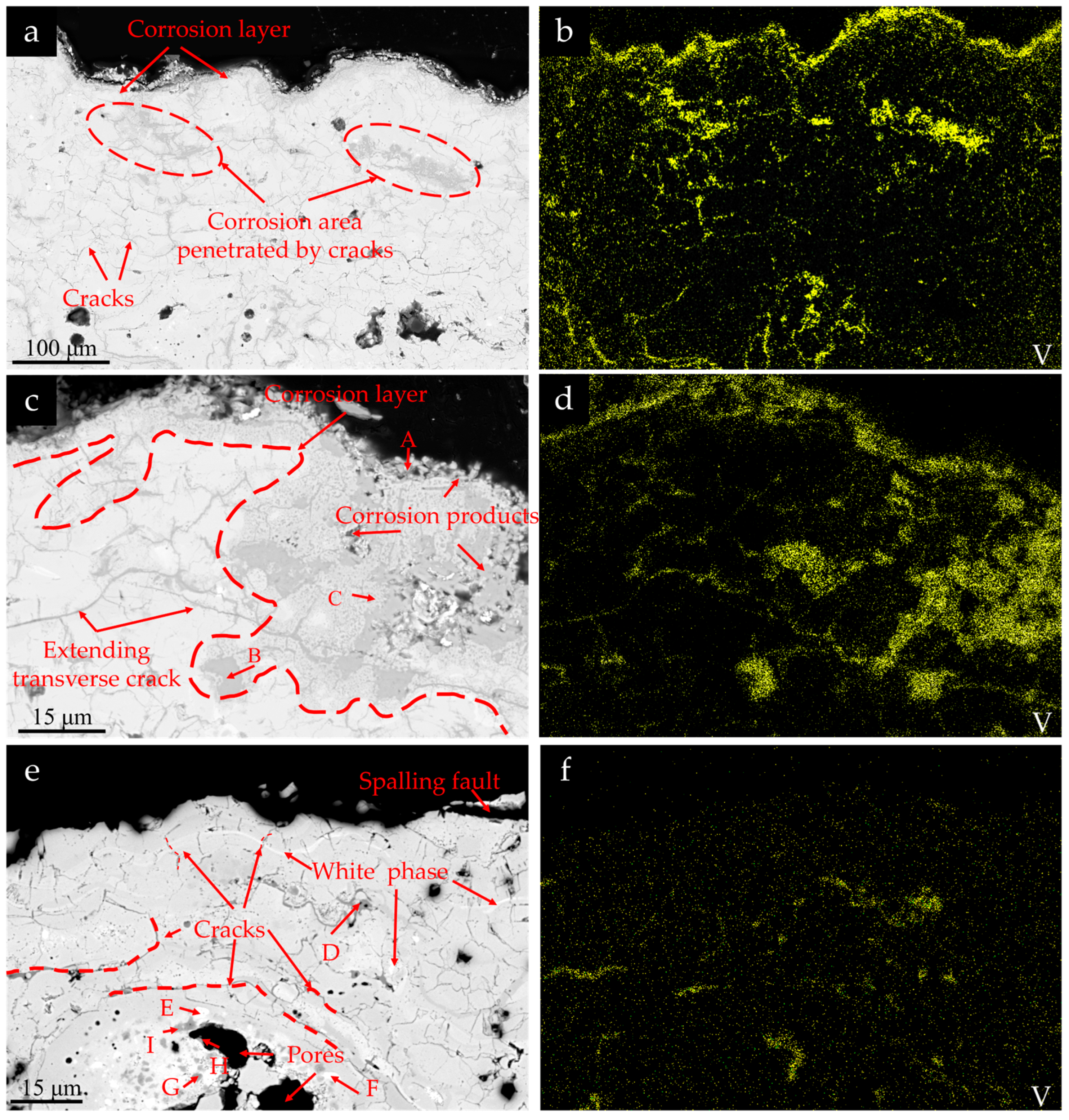 Figure 13e,f demonstrate the cross-sections and vanadium element distribution in peeling-off regions of the RHZ coating under identical corrosion conditions after 50 cycles. It can be seen that after 5 cycles of corrosion at 5 mg/cm