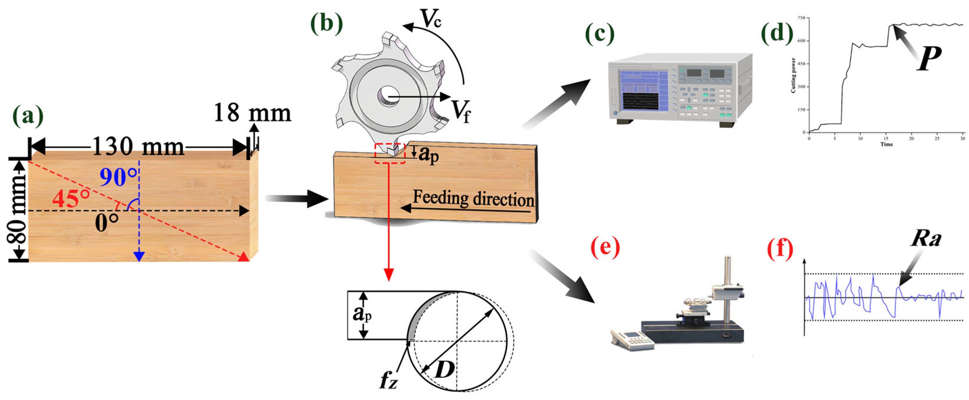 - Yu, Y.; Buck, D.; Yang, H.; Du, X.; Song, M.; Wang, J.; Zhu, Z. Cutting power, temperature, and surface roughness: A multiple target assessment of beech during diamond milling. Forests 2023, 14, 1163. [Google Scholar] [CrossRef]