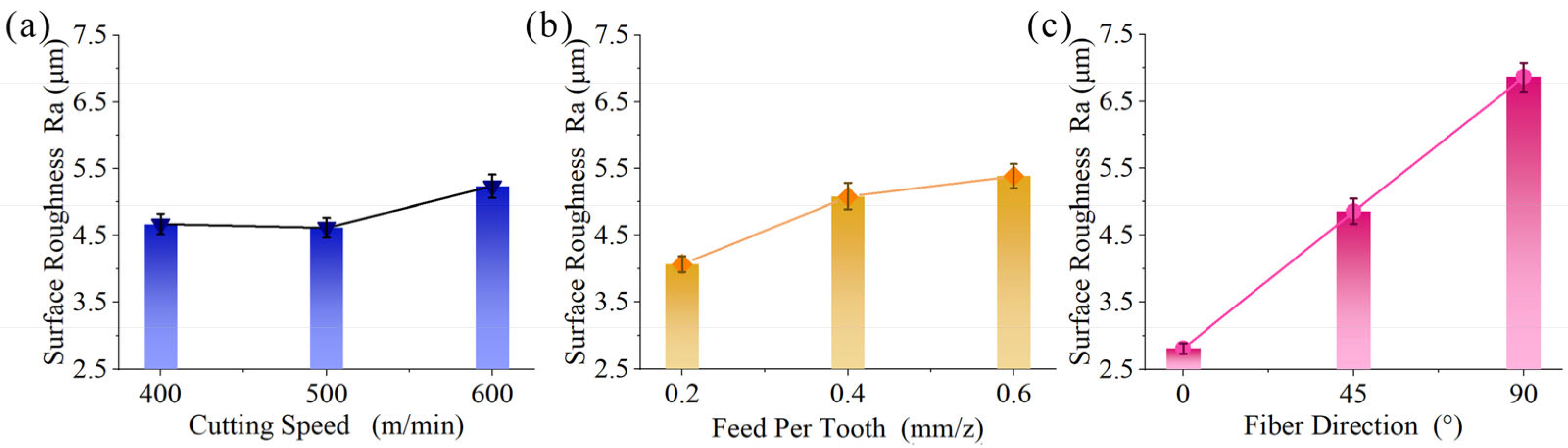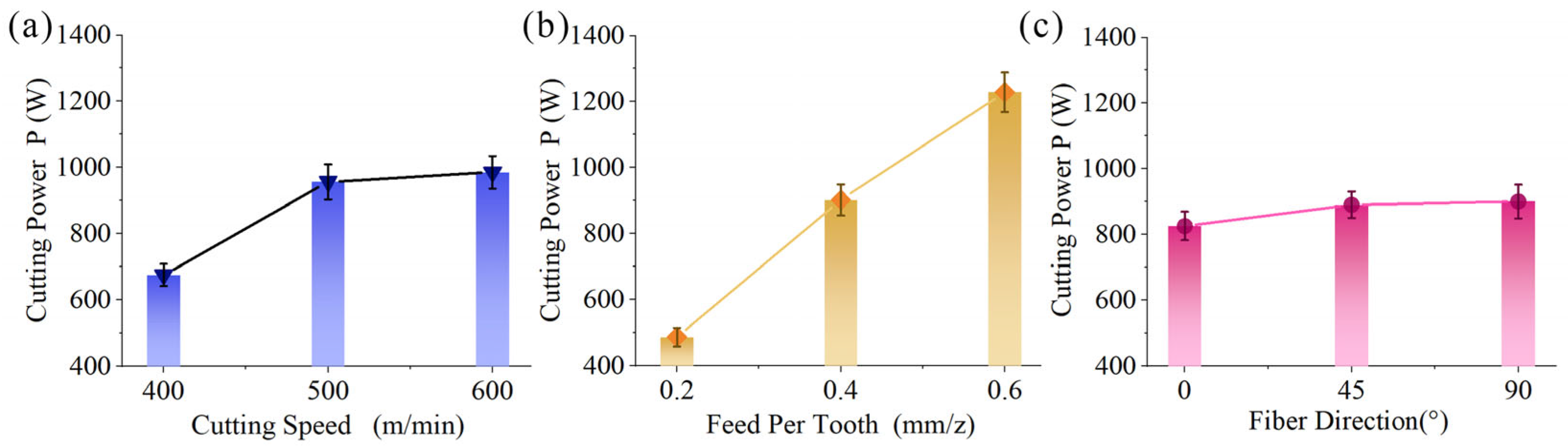 - As the fiber direction increased from 0° to 90°, the cutting power increased by 9.08% and the surface roughness rose by 143.85%. When the feed per tooth increased from 0.2 mm/z to 0.6 mm/z, the cutting power increased by 152.55% while the surface roughness went up by 32.46%. As the cutting speed increased from 400 m/min to 600 m/min, the cutting power increased by 41.67% and the surface roughness increased by only 13.35%.