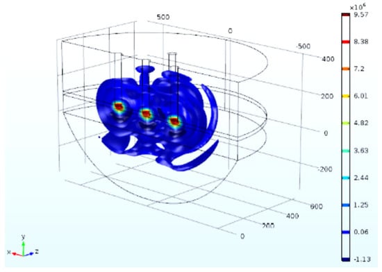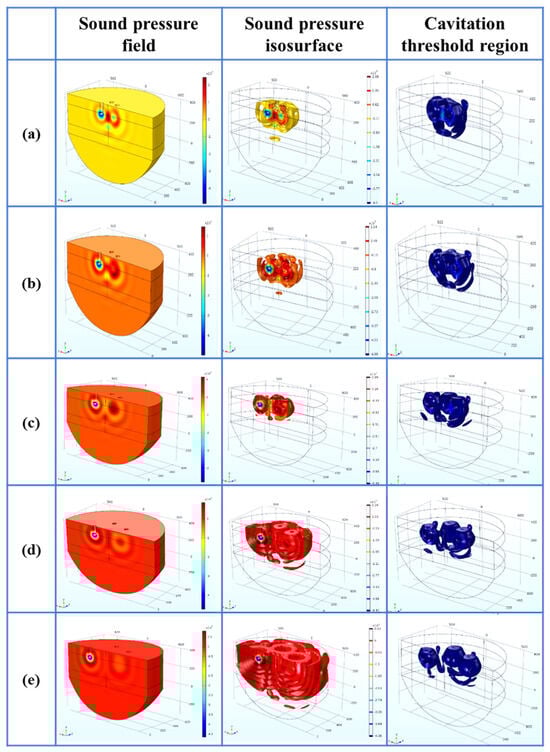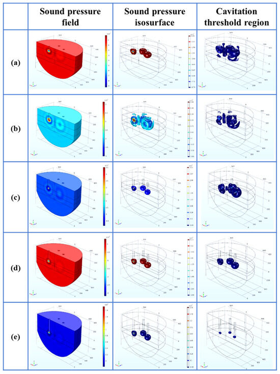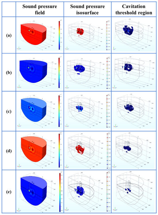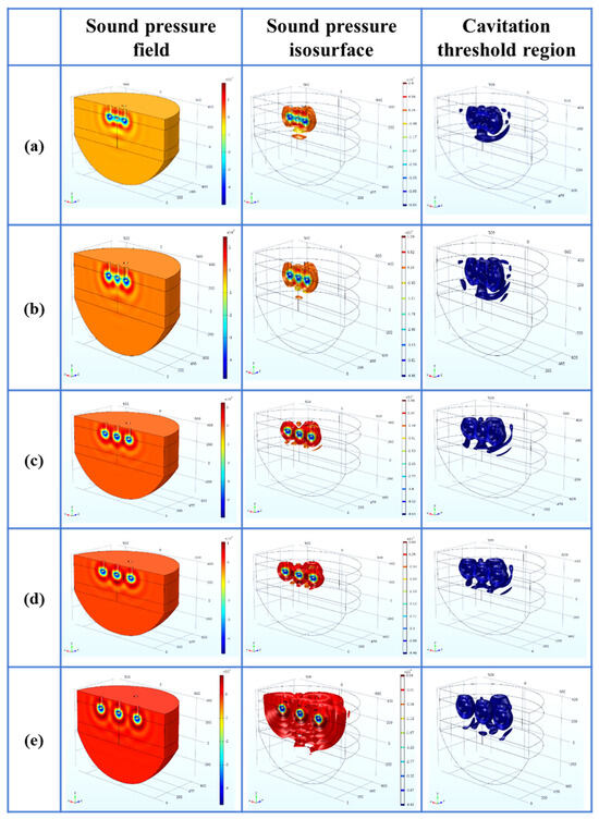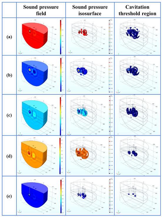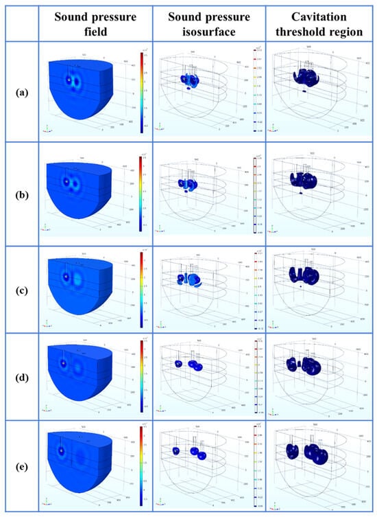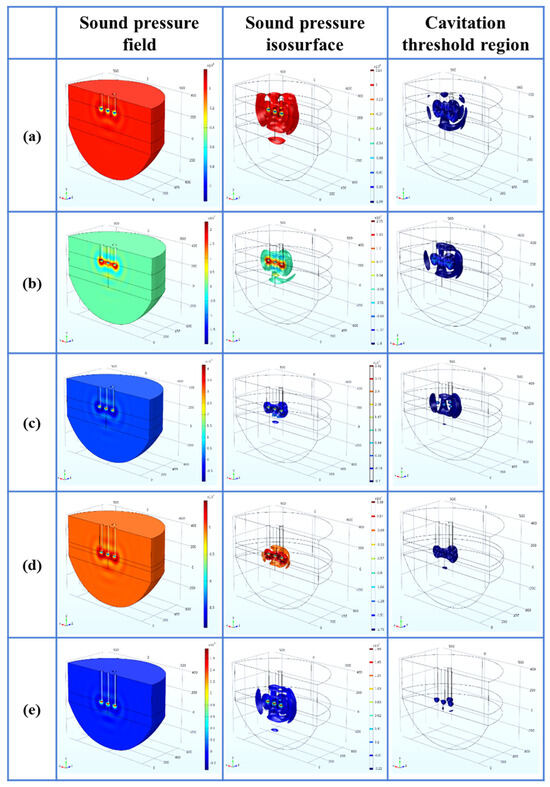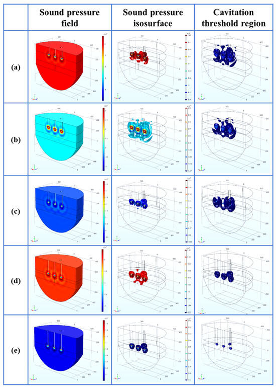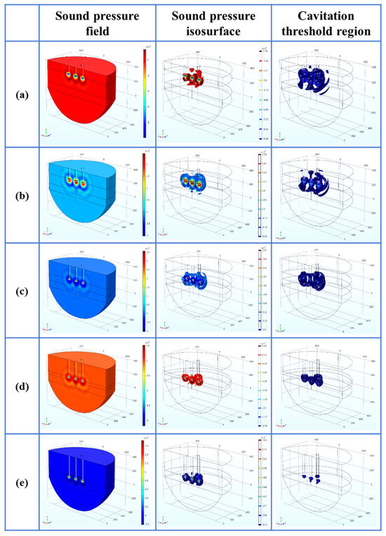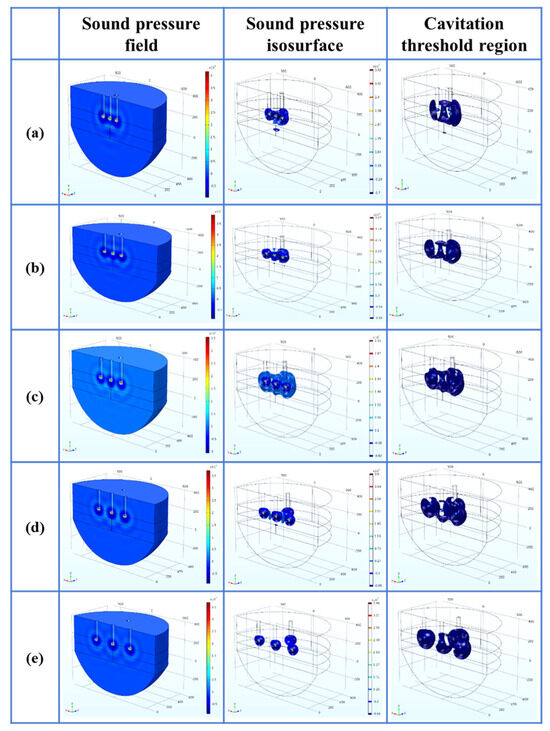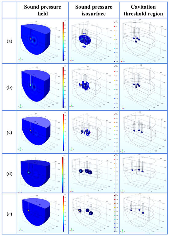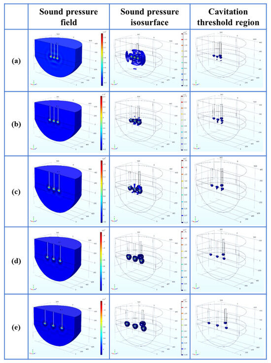- Within the parameter range discussed in this paper, the optimal process parameters are selected as the A arrangement, the distance L is 200 mm, the insertion depth H is 270 mm as the optimal arrangement, the cavitation depth is 360 mm, the percentage of the cavitation threshold region is 2.50%, and the sound pressure gradient in its sound pressure field is small.