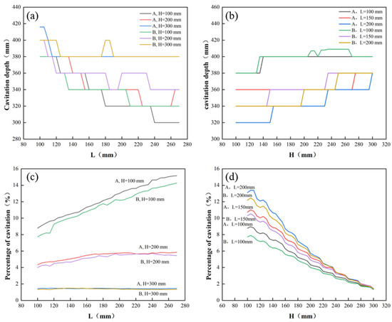 - When the value of L is certain, the percentage of cavitation decreases as the insertion depth H increases. When the value of L is 100 mm, changing the value of H has little effect on the depth of the cavitation threshold, and when the value of L is 150 mm and 200 mm, the increase in the value of H increases the depth of the cavitation threshold region, which is conducive to the improvement of the metal tissue.