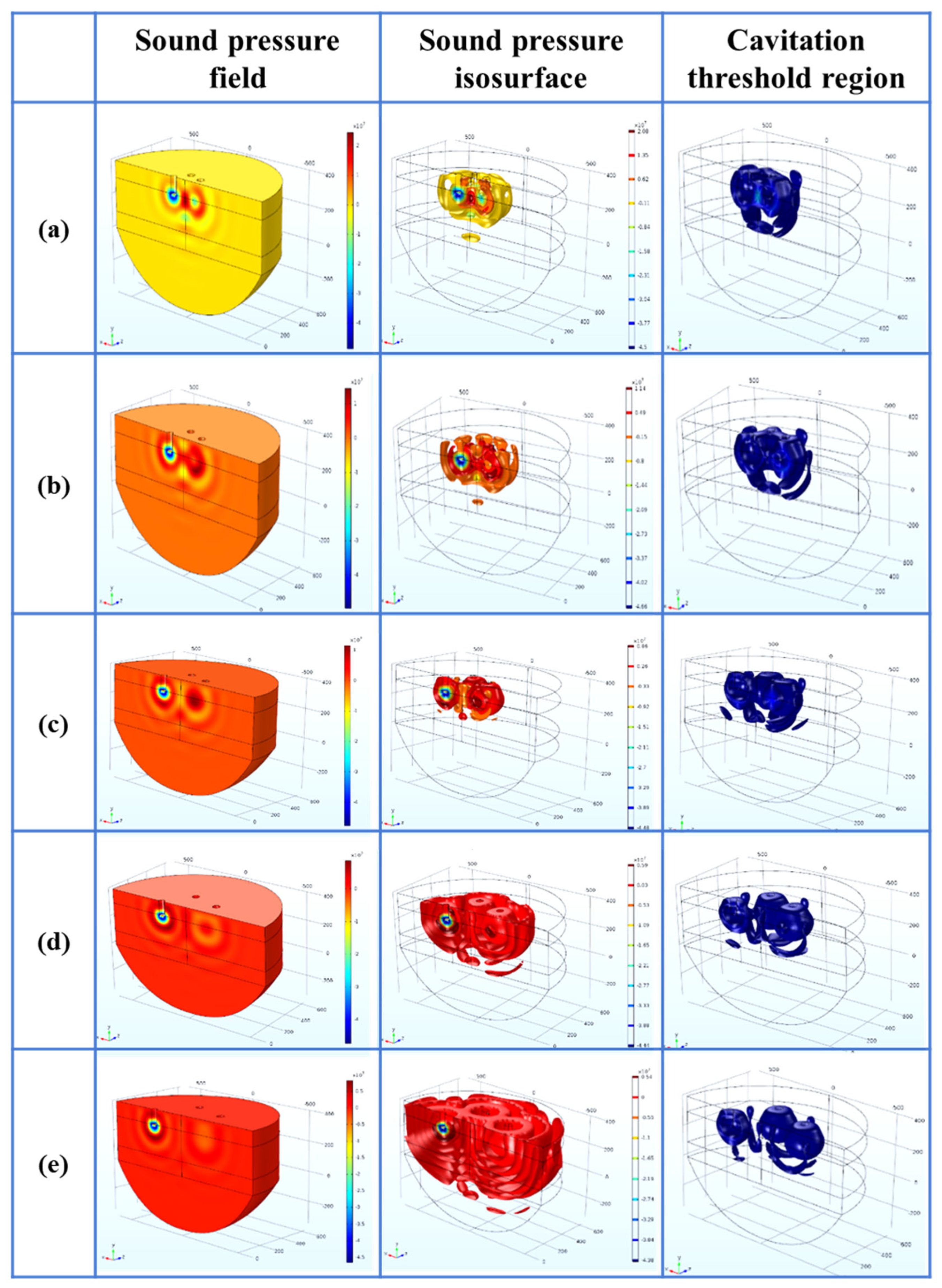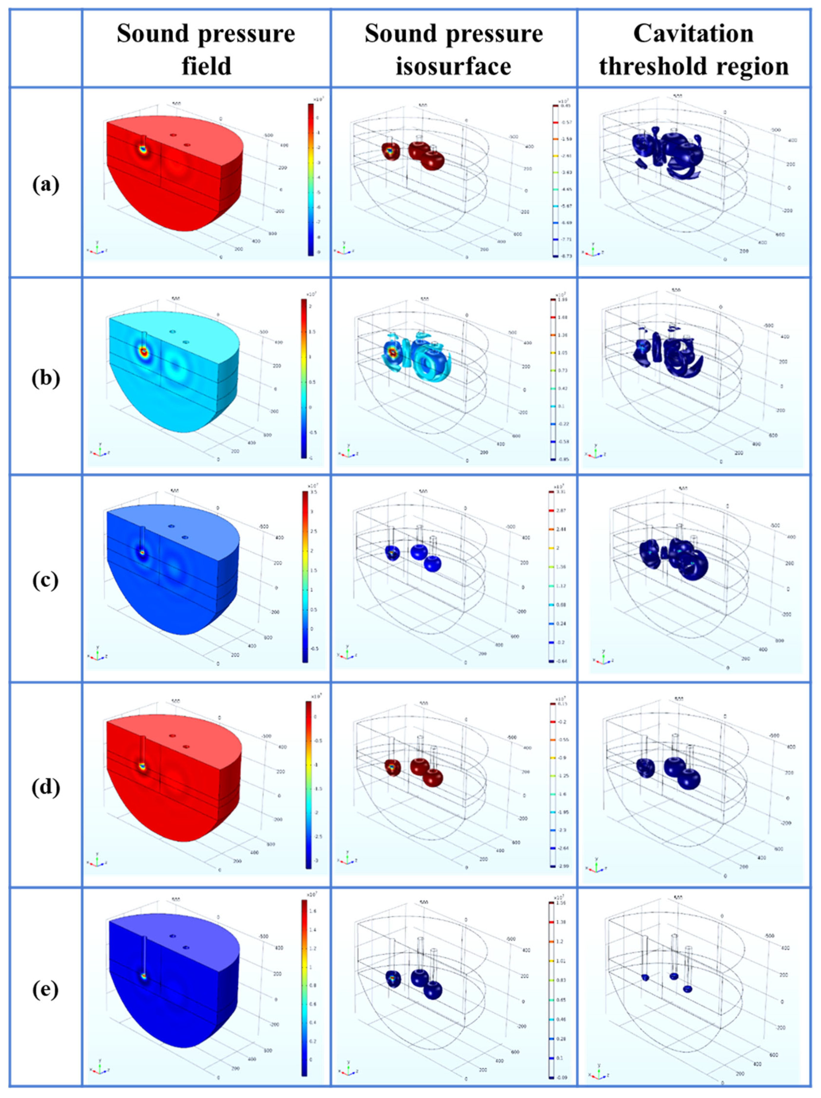 - Cavitation Threshold Grids: The number of grids with sound pressure values higher than 1.1 MPa in the calculation results extracted after post-processing, referred to as “Cavitation Grids”.