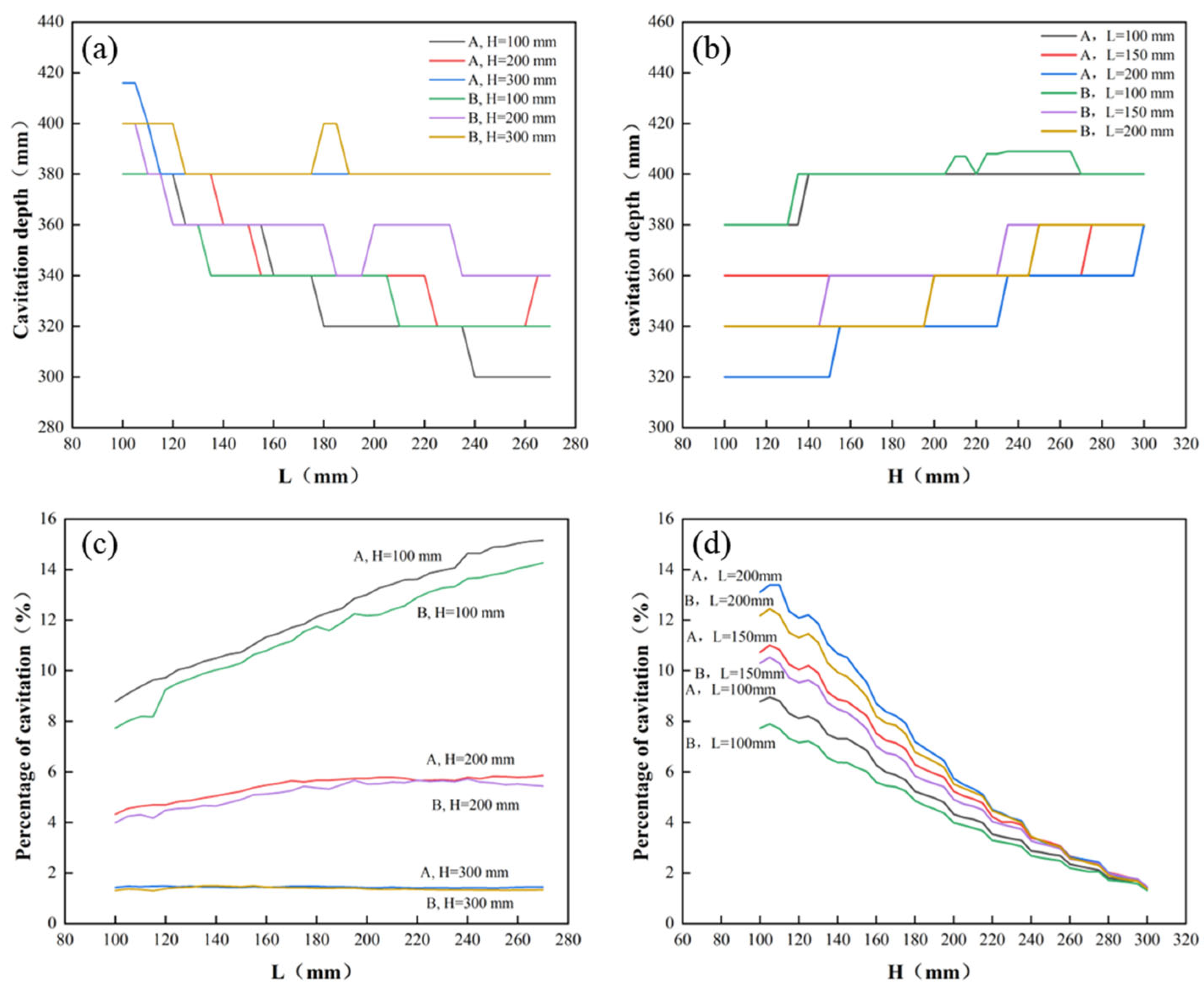 - When the value of L is certain, the percentage of cavitation decreases as the insertion depth H increases. When the value of L is 100 mm, changing the value of H has little effect on the depth of the cavitation threshold, and when the value of L is 150 mm and 200 mm, the increase in the value of H increases the depth of the cavitation threshold region, which is conducive to the improvement of the metal tissue.