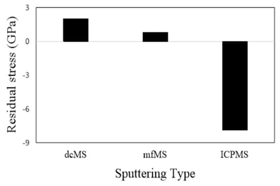 The residual stress results of the MoN thin films prepared by three sputtering methods, i.e., dcMS, mfMS, and ICPMS methods, are shown in Figure 2. Residual stresses generally affect all properties of thin films, including hardness, electrical resistance, adhesion, and wear and fatigue resistance.