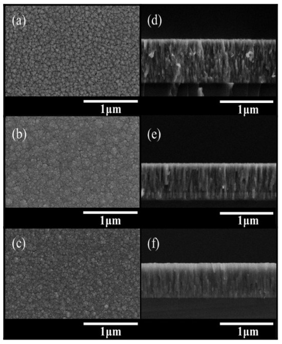Microstructure through FE-SEM for the MoN film surface [(a) dcMS, (b) mfMS and (c) ICPMS] and cross-sectional FE-SEM [(d) dcMS, (e) mfMS and (f) ICPMS].