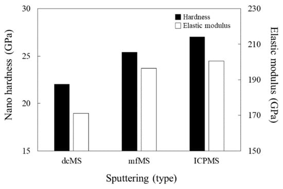 An ultraprecise nanoindentation tester was used to measure the nanohardness and elastic modulus of the MoN thin films prepared by three sputtering methods, i.e., dcMS, mfMS and ICPMS methods. The average values obtained from measurements at more than 30 locations with a scale of 1 micrometer per sample are shown in Figure 4. Due to the nanoindentation size effect, thin films with a thickness of a few hundred nm are almost impossible to measure precisely with a conventional micro Vickers hardness tester. Therefore, in this study, quantitative nanohardness measurements were performed according to the ISO 14577 standard nanoindentation measurement method. In particular, the weight applied to the particles for the nanohardness measurements of thin films was fixed at 5 mN and averaged to a point that is 1/10 of the total film thickness to eliminate indentation size effects, which tend to increase the measured hardness value with decreasing indentation depth [21,22].