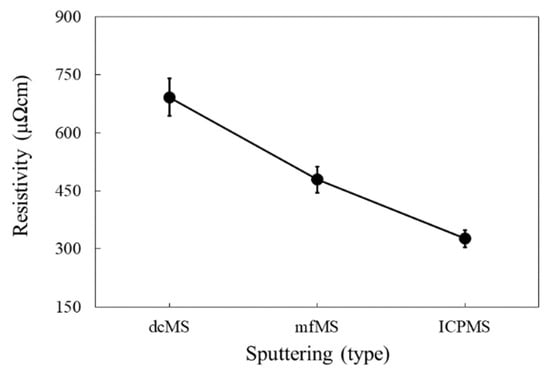 In this study, the van der Pauw method was used to measure the electrical resistance of the MoN thin films prepared by the dcMS, mfMS, and ICPMS methods. To avoid errors due to the size and lateral displacement of the contact needle, a cloverleaf structure with a diameter of 14 mm and a slit length of 3.5 mm was used. Figure 5 shows the results of the electric resistance of the MoN thin films measured at room temperature. The electrical resistance values varied considerably with the sputter deposition process and ranged from 325.8 to 691.6 μΩcm. The minimum electrical resistance (325.8 μΩcm) was obtained for MoN thin films prepared by the ICPMS method, whereas the maximum electrical resistance (691.6 μΩcm) was obtained for MoN thin films prepared by the dcMS method. These values are very similar to those reported in other studies for the electrical resistance values of MoN thin films prepared by the dcMS method [23].