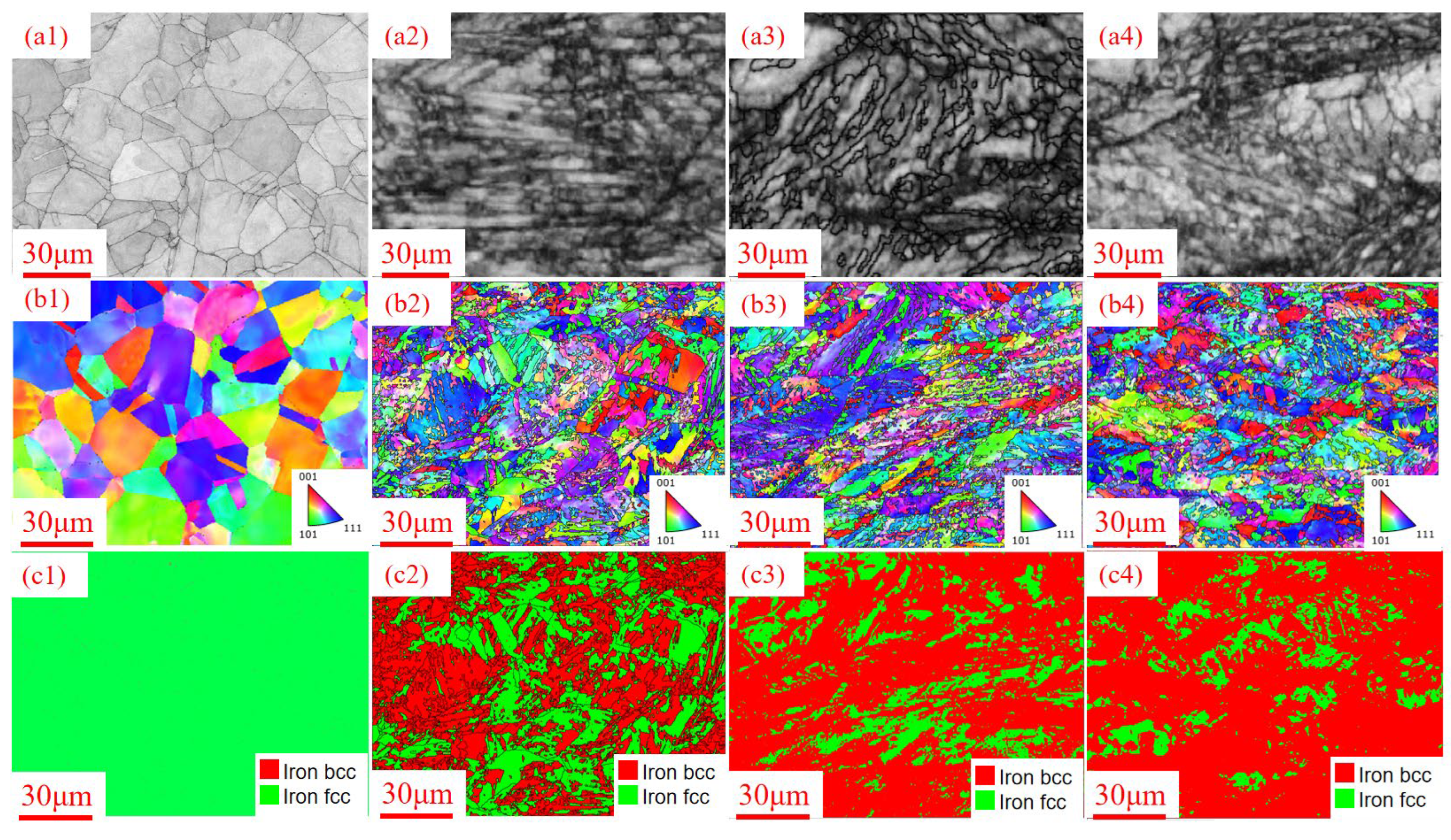 - Tao, H.M.; Cai, Y.F.; Li, Z.; Xiu, H.; Tong, Z.; Ding, M. Research on the synergistic evolution law of microstructure and properties of deformed austenitic stainless steel. Coatings 2025, 15, 845. [Google Scholar] [CrossRef]