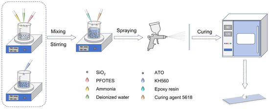 The composite coatings were prepared as illustrated in Figure 1. First, the slides were ultrasonically cleaned using anhydrous ethanol and deionized water, followed by blow-drying for surface hydrophilic treatment and set aside. 0.6 g of gas-phase SiO2 was dispersed in 20 mL of ethyl acetate and stirred at room temperature for 1 h. Then 0.5 mL of ammonia, 0.2 mL of deionized water, and 0.3 mL of PFDTES were added, and stirring was continued at 40 °C for 4 h to obtain dispersion A. The main body of the dispersion A was uniformly dispersed and surface-modified SiO2 nanoparticles. Subsequently, 0.8 g of ATO was dispersed in 20 mL of anhydrous ethanol, ultrasonically treated in a laboratory bath (220 W, 40 kHz, continuous mode) for 30 min, and then stirred for 1 h. Then, 1 mL of KH560 was added and stirred for 2 h to obtain Dispersion B. The purpose of Dispersion B was to homogeneously disperse ATO while modifying its surface as much as possible. Dispersions A and B were mixed together, and 4 g of epoxy resin (epoxy resin E51 mixed with 5618 curing agent at a mass ratio of 1:1) was added and stirred for 2 h at room temperature to obtain the final desired composite coating. The coating mixture was applied onto the pretreated glass substrates using a high-atomization spray gun (0.8 mm nozzle diameter, spray pressure of 25 psi, spraying distance 20 cm). To ensure uniform coverage and reproducibility, the coating was applied in 15 uniform passes (30 strokes) at a constant spraying speed. The samples were then cured at 80 °C for 2 h to produce the target superhydrophobic transparent thermal insulating (SHTTI) coatings.