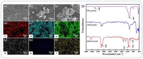 (a–c) SEM images of SHTTI-0.6-0.8 coating at different magnifications. (d–i) EDS energy spectra of the SHTTI-0.6-0.8 coating. (j) FTIR spectra of fumed SiO2 powders, ATO powders and SHTTI-0.6-0.8 coating.