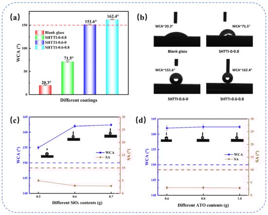 To systematically investigate the functional differences between ATO and SiO2 particles in composite coatings, the WCAs of blank glass, SHTTI-0.6-0, SHTTI-0-0.8, and SHTTI-0.6-0.8 were measured (Figure 3a,b). Compared to blank glass, both SHTTI-0.6-0 and SHTTI-0-0.8 exhibited significantly enhanced contact angles, indicating that both nanoparticles contribute to surface roughness. Notably, SHTTI-0.6-0 achieved a WCA of 151.6°, reaching the superhydrophobic state, while SHTTI-0-0.8 showed a lower WCA of 72.8°. This distinct difference demonstrates that PFDTES-modified SiO2 plays a dominant role in establishing micro–nanostructures and reducing surface energy, whereas ATO alone is unable to form a superhydrophobic interface. Furthermore, the SHTTI-0.6-0.8 coating exhibited a WCA of 162.4°, demonstrating typical superhydrophobic characteristics. Further analysis revealed that when the ATO content was fixed at 0.8 g, increasing the SiO2 content from 0.5 g to 0.6 g significantly enhanced the coating’s superhydrophobicity. However, a further increase to 0.7 g resulted in a negligible improvement in the WCA (Figure 3c). Similarly, with the SiO2 content fixed at 0.6 g, increasing the ATO content from 0.6 g to 1.0 g did not significantly improve superhydrophobicity (Figure 3d).