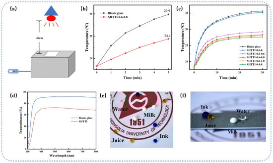 (a) Schematic photographs of the laboratory’s self-constructed thermal insulation test setup. (b) Blank glass and SHTTI-0.6-0.8 coating 5-Minutes temperature rise curve. (c) Natural warming curves for different coating integrity. (d) Transmittance curves of Blank glass and SHTTI-0.6-0.8 coating. (e) Optical photograph of SHTTI-0.6-0.8 coating. (f) SHTTI-0.6-0.8 coating on the surface of aluminum sheet.