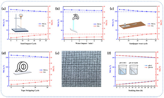 Schematic diagrams of various tests and wettability change curves of SHTTI-0.6-0.8 coating: (a) Sand impact test. (b) Water impact test. (c) Sandpaper wear test. (d) Tape stripping test. (e) Cross-cut adhesion test results of the SHTTI coating. (f) Acid and alkali solution immersion test. Red and blue dotted lines indicate the superhydrophobic thresholds of 150° and 10°, respectively.