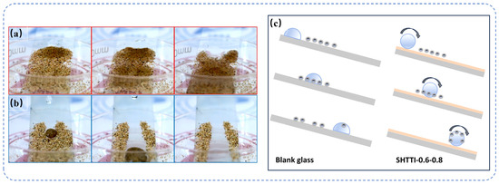 Superhydrophobic surfaces have attracted much attention due to their excellent self-cleaning property, which is manifested by the fact that contaminants adhering to the surface can be effectively removed by a small amount of water flow. To verify this property, quartz sand was chosen as a simulated contaminant for self-cleaning experiments in this study (Figure 6a,b). It was observed that the droplets rolled down in a spherical shape on the surface of the SHTTI-0.6-0.8 coating placed at an angle. During the rolling down process, the droplets adsorbed the quartz sand particles on the path and realized the effective cleaning of the path. In contrast, the droplets are difficult to move on a normal glass surface and therefore cannot remove contaminants. Figure 6c illustrates the self-cleaning principle. When a droplet touches the surface of a normal slide, it is unable to maintain its spherical shape and spreads out, thus failing to effectively hold and carry away contaminants. However, due to the special wettability of the superhydrophobic surface, the droplet is able to maintain its spherical shape without spreading, and the contaminant can be encapsulated inside the droplet. As the droplet rolls away from the surface, the contaminant is removed and the surface is self-cleaning.
