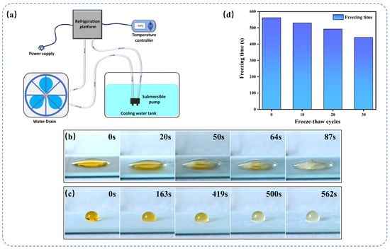 (a) Schematic diagram of the custom-built semiconductor refrigeration platform. Freezing process of the water droplet on (b) blank glass, (c) SHTTI-0.6-0.8 coating. (d) Freeze–thaw cycle test for anti-icing.