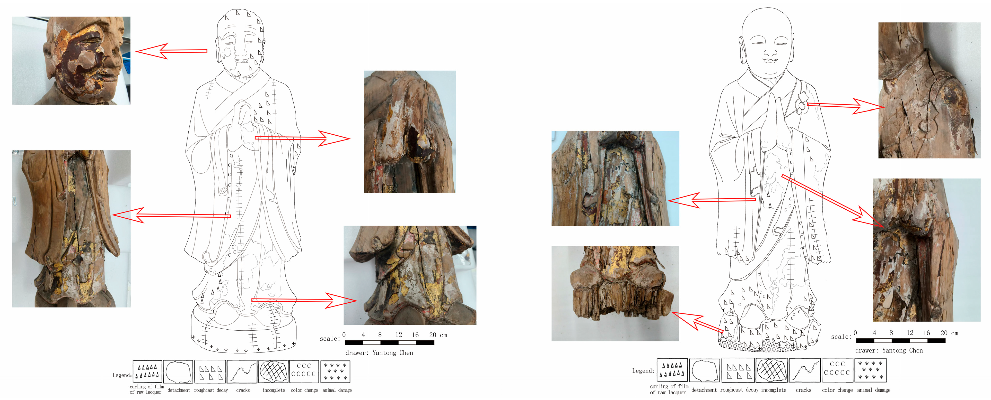 - Lu, Y. Preliminary research on the Protection of Ming Dynasty Polychromoe Woodcarving Seated Statues in the collection. Sci. Conserv. Archaeol. 2014, 26, 57–68. [Google Scholar] [CrossRef]