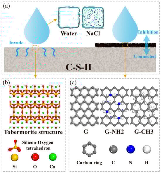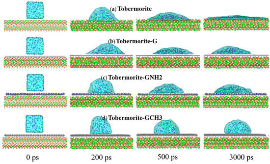 However, the hydrophobic protection mechanisms of FGSs cannot be elucidated from the perspective of the interaction between water molecules, ions, and FGS functional groups by experimental methods, which hinders the design of a new generation of hydrophobic FGSs. Consequently, complementary computational approaches are required. Molecular dynamics (MD), as a powerful tool for characterizing the micro–nano scale of structure, has been widely used in the field of cement and concrete [32]. The primary hydration product of concrete is calcium silicate hydrate (C-S-H) gel, whose molecular structures have been basically clarified [33,34]. By the advantage of MD simulations, Zhu et al. [35] verified the hydrophilicity of the C-S-H surface using the ReaxFF force field and further revealed the wetting properties of nanodroplets from the perspective of surface free energy and adhesion. Zheng et al. [36] comparatively analyzed the wetting properties of nanodroplets on four distinct cement hydration product substrates, elucidating the wettability-driven mechanisms governed by localized structural variations at the substrate/droplet interface. Li et al. [37] employed MD simulations to investigate modification strategies for the wettability of C-S-H surfaces using fluoroalkylsilane superhydrophobic coatings, in which the operative mechanisms of these coatings were systematically evaluated with respect to calcium leaching and chloride penetration. Although a large number of studies have revealed the influences of graphene-based materials on the mechanical properties [38,39,40,41] and solution transport properties [23,42] of the cement-based system by MD simulations, the research on graphene-based materials directly coated on a cement-based surface for hydrophobic protection is still lacking at the atomic scale.