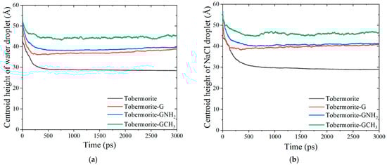 The changes in centroid heights with time of (a) water and (b) NaCl droplets on tobermorite and tobermorite coated with three graphene-based material interfaces.