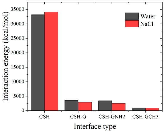 Further, the interaction energy between water/NaCl droplets and the composite interfaces was calculated. As shown in Figure 5, the tobermorite surface exhibits strong interaction energy with droplets attributable to its strong hydrophilicity. With the addition of graphene-based materials, the interaction energy decreases significantly, which can be ranked as tobermorite > tobermorite-G > tobermorite-GNH2 > tobermorite-GCH3. It is indicated that the increasing interaction energy results in the stronger interface hydrophilicity and the smaller contact angle. Notably, NaCl displays higher energy than water on tobermorite whereas this relationship reverses on coated surfaces. This demonstrates distinct ion adsorption properties on tobermorite relative to coated interfaces, further modulating water molecule distribution around surfaces and consequently influencing water–interface interactions. To elucidate the influences of distributions and local structures of water molecules and ions at different interfaces on wettability, the atomic intensity and the radial distribution function (RDF) are further analyzed as important indicators.
