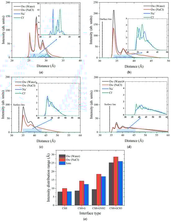 The intensity distributions of Ow, Na+ and Cl− ions perpendicular to the surfaces of (a) tobermorite, (b) tobermorite-G, (c) tobermorite-GNH2 and (d) tobermorite-GCH3. (e) Intensity distribution ranges of Ow and ions with the change in interface types.