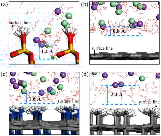 According to the results mentioned above, the addition of ions elevates the interface contact angle, attributable to the formation of Na-Ow and Cl-Hw hydration shells. As shown in Figure 9a,b, the Na-Ow RDF displays distinct peaks at 2.35 Å and 4.45 Å, and that of Cl-Hw shows obvious peaks at 2.25 Å and 3.65 Å. This confirms that both Na+ and Cl− can form two layers of hydration shells with water molecules, thereby constraining the movement of surrounding water molecules to a certain extent, which is defined as the “ionic cage restriction”. The schematic diagrams of the ionic hydration shell structure are shown in Figure 9c,d.