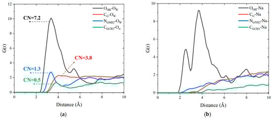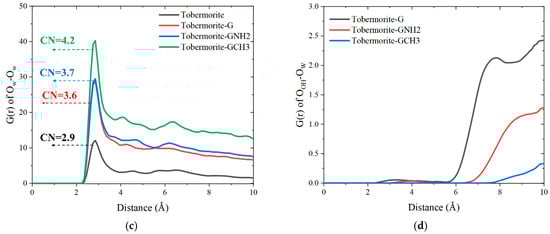Tobermorite and its graphene-based coatings have different interactions with water and ions, which can be reflected in the bonding strength structurally, leading to different wetting behaviors. As a powerful tool, RDF was used to analyze the radius and strength of bonding between different atoms [66], and the formula is as follows: