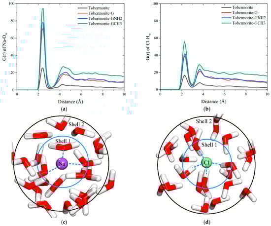 RDF curves of (a) Na-Ow and (b) Cl-Hw in tobermorite and tobermorite–graphene-based coating systems. Schematic diagrams of ionic hydration shell structures of (c) Na-Ow and (d) Cl-Hw.