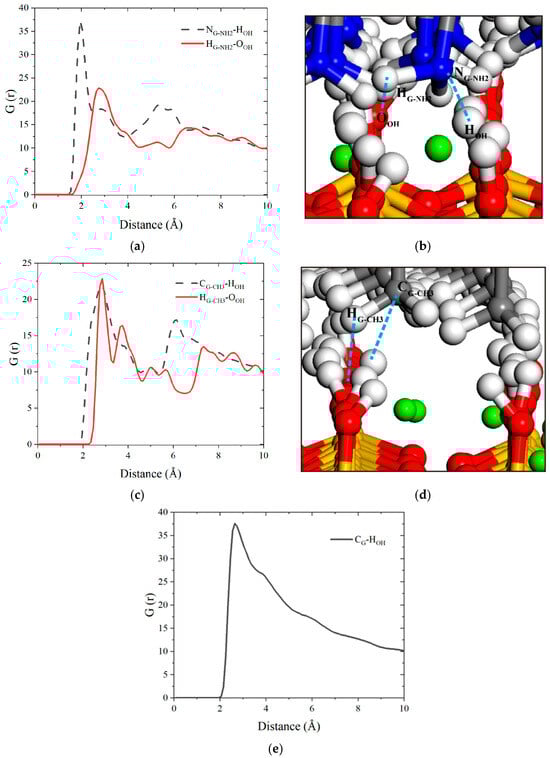 The RDF is further used to analyze the interfacial bonding characteristics between graphene-based coatings and the tobermorite substrate. Pronounced interfacial bonding behavior indicates superior adhesion of graphene-based coatings onto tobermorite surfaces, which is an important factor for evaluating the properties of graphene-based coating materials. As shown in Figure 10a,c, the RDFs of NG-NH2-HOH, HG-NH2-OOH, CG-CH3-HOH and HG-CH3-OOH show obvious peaks at 1.95 Å, 2.75 Å, 2.85 Å and 2.85 Å, respectively, and have the characteristics of multiple-peak distribution. These distinct short-range peaks indicate that atoms within the functional groups of FGSs form bonds with surface oxygen and hydrogen atoms of the -OH groups in tobermorite. This configuration establishes a mechanical anchoring mechanism, thereby enhancing interfacial interlocking performance. The schematic diagrams of interface connection structures are displayed in Figure 10b,d. For the graphene sheet lacking functional groups, Figure 10e exhibits only a single and broad RDF peak, indicating weak adhesion to the tobermorite surface. After clarifying the interfacial structure between graphene-based coatings and the tobermorite surface, dynamic bonding stability emerges as another critical performance metric for interfacial bonding evaluation. Quantitative analysis of this property will be addressed subsequently.