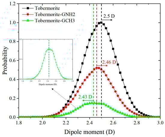 The dipole moment magnitude of water molecules can be employed to analyze the hydrophilic and hydrophobic properties of different interfaces, which enables a deeper understanding of water wetting behaviors under interfacial influences [67]. The magnitude of the dipole moment is equal to the product of the distance between the centers of positive and negative charges and the amount of charge carried by the charge center, with its direction pointing from the positive charge center to the negative charge center. The downshift in dipole moment distribution indicates that the surface hydrophilicity is weakened, while the opposite indicates the increase in surface hydrophilicity. The water dipole moment distribution within 2 Å of the surface line of different interfaces was calculated, as shown in Figure 11. In the tobermorite system, the mean magnitude of the dipole moment is approximately 2.5 D, which is consistent with previous research [36,64]. The value is weaker than the 2.51 D reported by Youssef et al. [67], as the water molecules that they studied were constrained by the silica chains. Moreover, this value exceeds that of bulk water molecules (2.44 D), which can be attributed to the strong electric field of the hydrophilic interface that polarizes water molecules beyond the self-polarization level of ordinary liquid water [68]. With the addition of graphene-based coatings, the dipole moment curve shifts to the left. After GNH2 modification, the dipole moment of water molecules decreases to 2.46 D, indicating a reduction in water molecule polarity, although it remains higher than the mean dipole moment of bulk water. This could be attributed to the weak hydrogen bonding interaction between GNH2 and water molecules. After GCH3 functionalization, the mean dipole moment of water molecules approximates 2.43 D, approaching that of bulk water and demonstrating increased disorder among water molecules. Consequently, the surface modification significantly modulates the polarity of water molecules, thereby governing interfacial wetting behavior.
