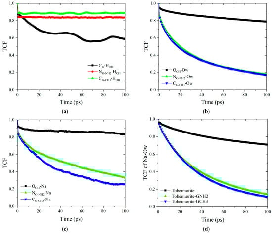 TCFs: (a) tobermorite and graphene-based coatings, (b) different interfaces and water molecules, (c) different interfaces and Na+ ions and (d) Na+ ions and water molecules.
