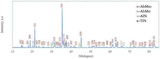 On the surface, a 5–7 µm thick layer (layer I) with a heterogeneous structure was formed. The layer is primarily composed of dark gray, nearly black grains surrounded by light, almost white inclusions. X-ray diffraction analysis of the coating surface (Figure 3) revealed the presence of peaks corresponding to molybdenum aluminides Al8Mo3 (75.57 wt%; lattice parameters: a = 9.207 Å, b = 3.632 Å, c = 14.862 Å) and Al3Mo (17.86 wt%; lattice parameter: a = 4.932 Å), as well as nitrides AlN (3.31 wt%; lattice parameters: a = 3.106 Å, c = 4.975 Å) and TiN (3.26 wt%; lattice parameter: a = 4.244 Å The chemical composition of the coatings was interpreted using the Al–Mo, Al–N, Mo–N, and Mo–Si phase diagrams [25] and correlated with the X-ray diffraction analysis data.
