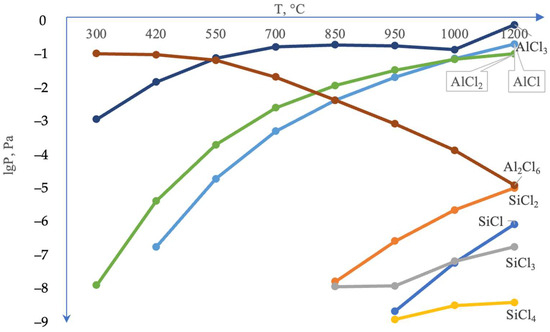 It is noteworthy that the silicon content in the coating’s surface layer is very low, not exceeding 0.21–0.26 wt.%. According to thermodynamic calculations under conditions of complex aluminosiliconizing treatment, aluminizing is more favorable than siliconizing. This is attributed to the higher partial pressure of aluminum chlorides compared to silicon chlorides (Figure 4).